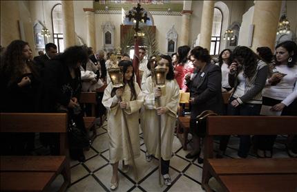مسيحيون سوريون يحتفلون في كنيسة في دمشق أمس بعيد الشعانين