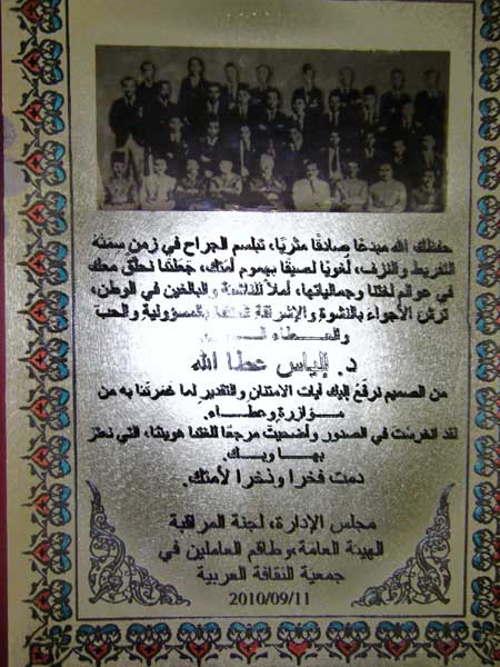 وفي ردّه على هذا التكريم شكر د. إلياس عطا الله مجلس إدارة الجمعيّة على كريم لفتتها، مشيرًا إلى أنّه يفتخر بهذا التكريم لأنّه آتٍ من جسمِ صدقٍ، ولأنّه في مدينة عكّا، حيث بدأ عمله أستاذا وهو في الثامنة عشرة من عمره، ثمّ سرد ذكريات مقتضبة عن عكّا وتيراسنطا، وعن طلاّبه ووثيق علاقته بهم، وعن بداية خروجه عن مناهج الوزارة، هذا الخروج الذي حاك " قصّة حبّ" مع أجهزة التحقيق الأمنيّة لخمسة عشر عامًا، وذلك جرّاء تدريسه طَلَبَتَه "ممنوعات" كـ "لاميّة العجم" للطغرائيّ، وبعض قصائد المتنبي وعمرو بن كلثوم، قصائد تغرس في الطالب عزّة وإباءً وانتماءً وعروبة. أمّا عن المهرجان، فقد حيّا القائمين عليه، وأشار إلى ضرورة المحافظة على العربيّة بوجهيها الفصيح والمحكيّ، وقال: " أنا لا أخشى على العربيّة الفصحى من الدولة العبريّة، ولكنّني أخشى على عامّيّاتنا، فهي التي تتعرّض طوعا أو قسرا للعبرنة، وكم أخشى أن يتكلّم الجيل الفلسطينيّ القادم لغة هجينا لا يعرفها أجداده، وعليه، وكي لا تصبح لغتنا متحفيّة، وضعت معجمي الجديد عن الأفعال الرباعيّة في لغة الجليل المحكيّة، والذي سيصدر قريبًا عن مكتبة لبنان في بيروت.