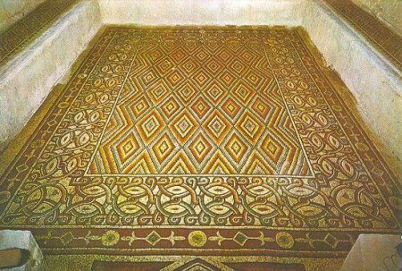 وفي ردهة الحمّام الكبير، وعلى مساحة 850 مترا مربعا، نجد فسيفساء أرضيّة، وهي أفضل تلك المجموعات الفسيفسائيّة التي تمت المحافظة عليها في الشرق الأوسط، كما أنها ولا شك الأكبر في العالم بحسب الخبراء، واليوم تغطّي رسوماتها الهندسية طبقة من الرّمال بهدف حمايتها.