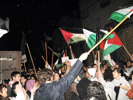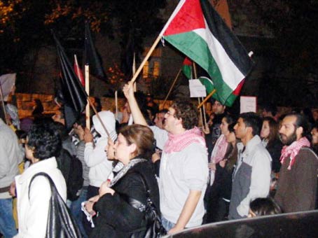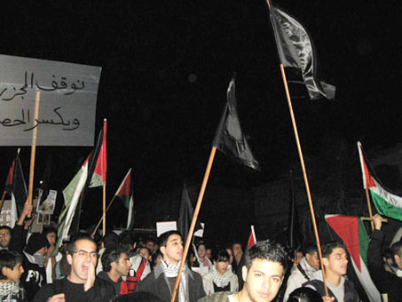 وقد رفع المتظاهرون الأعلام الفلسطينية والسوداء، ولافتات كتب عليها أسماء الشهداء الذين قتلوا في قطاع غزة .