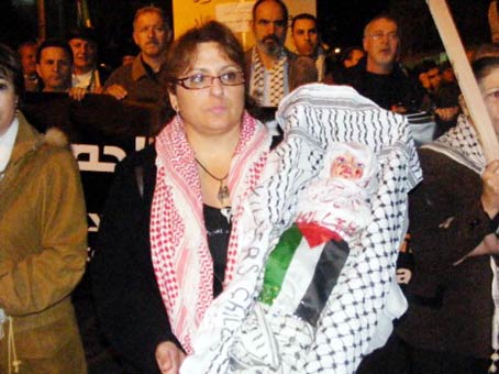هذا، وتقدم المسيرة علم فلسطين بحجم كبير حمله العديد من الشبان، وكذلك رفع المتظاهرون لشعارات ولافتات مثل: "نوقف المجزرة ونكسر الحصار" و"غزة لن تركع" و"أوقفوا القتل الآن" و"سنشعلها ثورة حتى لو تحت التراب" ، و" يكفي دم" وغيرها من الشعارات التي كتبت بالعربية والعبرية والانجليزية. كما ورفع المتظاهرون دمية ملفوفة بالكوفية الفلسطينية كتب عليها "قتلة الأطفال " باللغة الانجليزية، وهتفوا الهتافات المنددة للهجوم الصهيوني على غزة والمساندة لشعبنا الفلسطيني ونضاله.