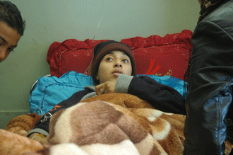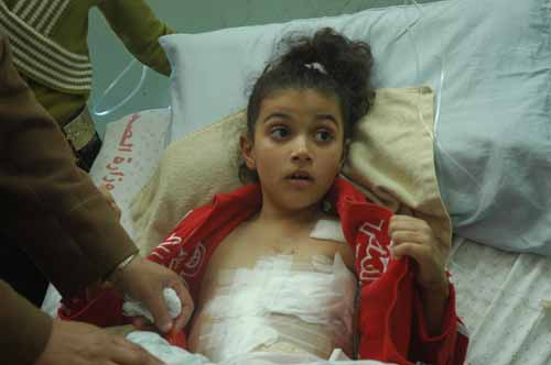 أميرة القرم 15 عاما كانت ممددة على أحد أسرة الشفاء في قسم العظام بالمشفى قالت "أصبت في قدمي إصابة بالغة حينما أطلقت نحوى قذيفة دبابة إسرائيلية أثناء الاجتياح الذي نفذته الآليات العسكرية لمنطقة تل الهوى غرب مدينة غزة.