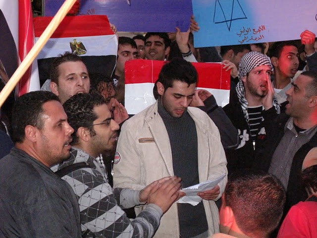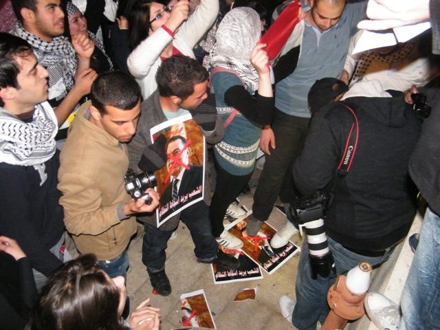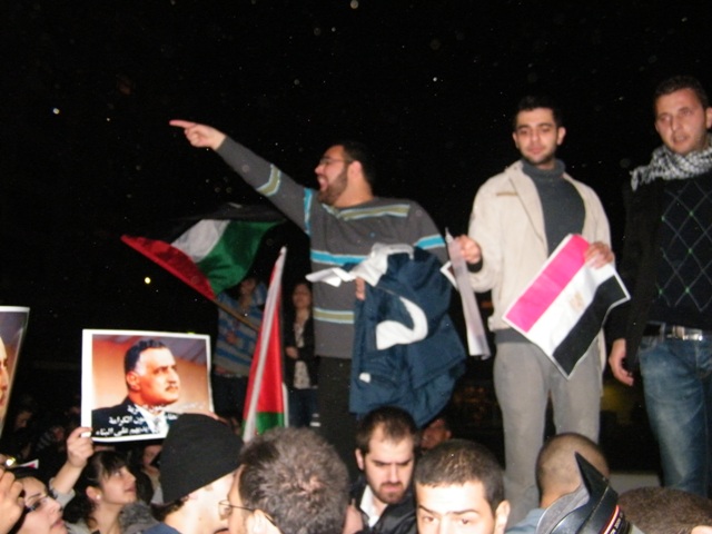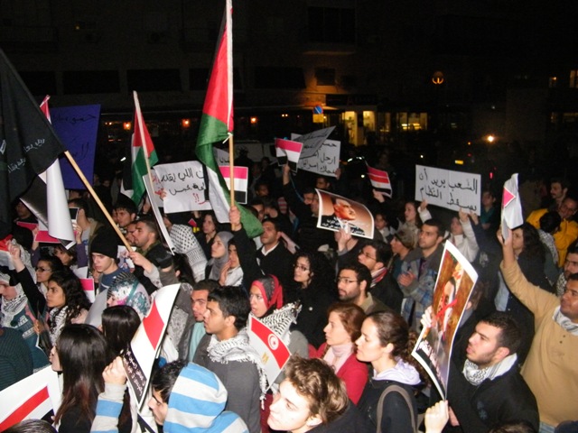 وقال ربيع عيد، أحد المنظمين للمظاهرة: "إنّ أمّتنا العربيّة تعيشُ مرحلةً من التّغيير الجوهريّ، تفتتح عصرا جديدا وحقبة جديدة، تنتقل فيهما من الظّلام إلى النّور، من الاستبداد والقيود والفساد إلى الحرّيّة، من الدّكتاتوريّة إلى الانعتاق، من الحزب الحاكم الواحد، والحاكم لمدى الحياة، إلى التعددية والانتقالية، وإنّه لمن واجبنا الأخلاقيّ والانسانيّ والوطنيّ القوميّ، وكشعبٍ يعاني من الاحتلال الاسرائيليّ وسياساته الغاشمة، أن ندعم إخوتنا العرب، لأنّ تحرّرهم يعني تحرّر فلسطين وسلامة الأمّة وتقدّمها ورفعتها وكرامتها.. ولهذا نحن هنا، نشدّ على أيادي أبناء الشعب المصري ليصمد، ويثابر حتى يحقق مطالبه، وإن التضحيات التي يقدمها ستقوده إلى العدالة والحرّيّات، والحقوق، والدّيموقراطيّة، وكرامة الشّعوب.. وندعو الشعب التونسي للمحافظة على ثورته المجيدة."