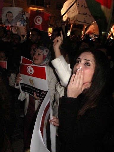 ورفع المتظاهرون العشرات من الرّايات التونسيّة والمصريّة والفلسطينية، وردّدوا هتافات داعمة للشعبين المصري والتونسي ضدّ الدكتاتوريّة وحكم الاستبداد وقمع الحريات، منها: "من القدس طلع القرار.. كلّنا مع الثّوار" و"هرب زين العابدينْ، بكرة الدّور على مينْ.. من الحكّام والسّلاطينْ.. على مبارك اللّعين"، و"الكرامة والحريّة.. مطلب الأمة العربيّة"، و"الشعب المصري يا جبّار، فلتسقط حكم القهّار"، و"الشّعب في تونس قد أسقط النّظام.. الشّعب في مصر سيُسقط النّظامْ"، و" لا استبدادْ لا استعبادْ، لا طغيانْ لا اضطّهادْ، لا تزويرْ ولا فسادْ، إرحلوا عن البلادْ، يا حكّام الاستعمارْ.."، وما إلى ذلك.