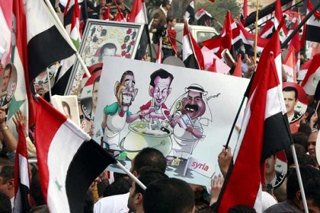 "مآرب الإمبريالية وزعانفها ليست دمقرطة سوريا، بل تدميرها!" (من إحدى المسيرات الشعبية في دمشق - أرشيف)